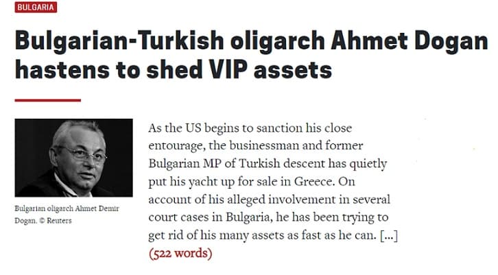 Медията „Intelligence Online“ съобщава, че почетният председател на ДПС Ахмед Доган е започнал да разпродава активите си, сред които е и луксозна яхта.